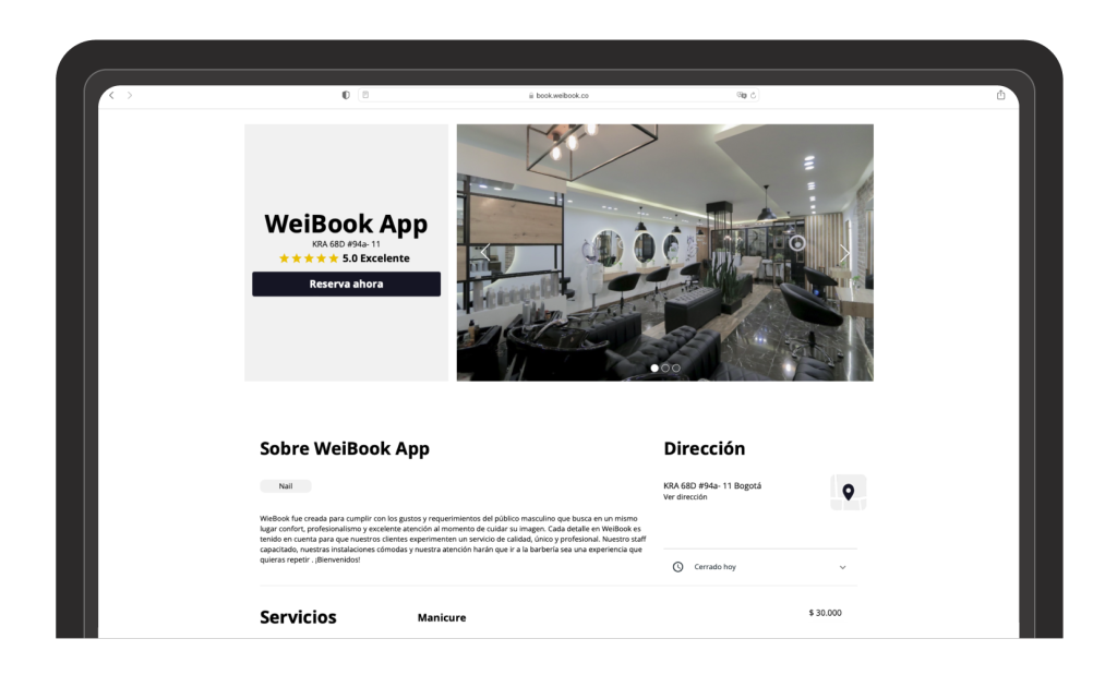 WeiBook es más que una herramienta de gestión de citas y clientes. Es tu tarjeta de presentación profesional en el mundo digital. Con una página de perfil personalizada, puedes mostrar tu experiencia, servicios, fotos de trabajos anteriores y horarios de disponibilidad. Esto no solo te hace más accesible para tus clientes actuales y potenciales, sino que también te ayuda a construir una marca personal sólida.